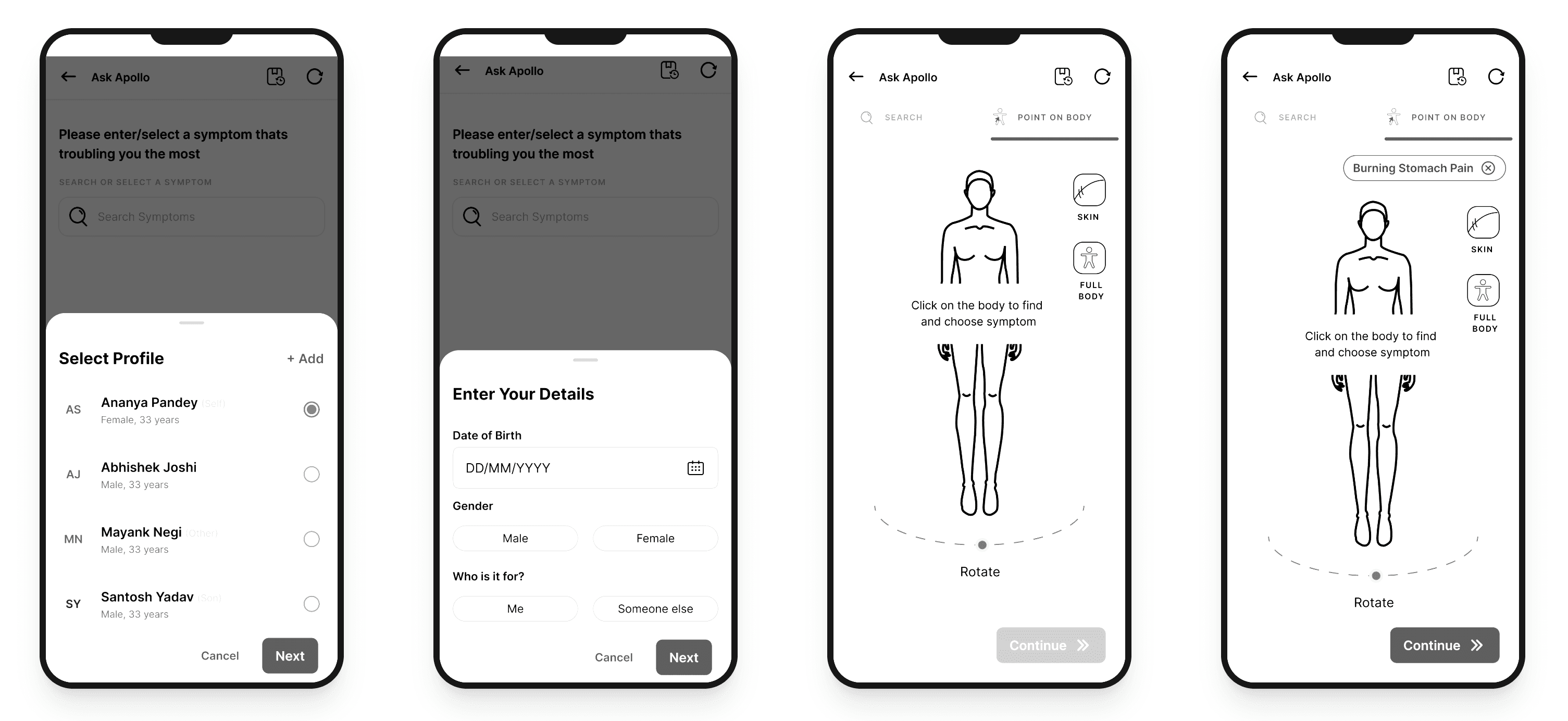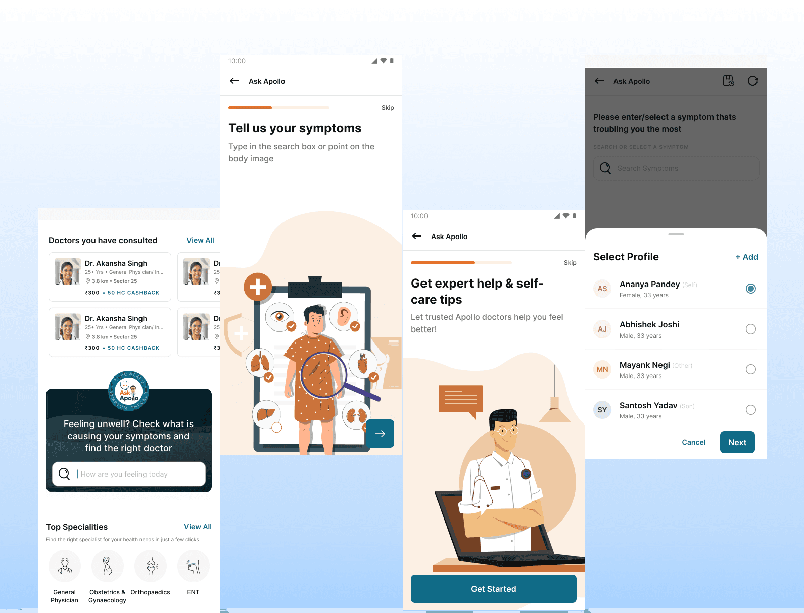 Healthcare decisions are often made for family members. To support this behavior, the experience begins by allowing users to select the profile of the person they are seeking care for.